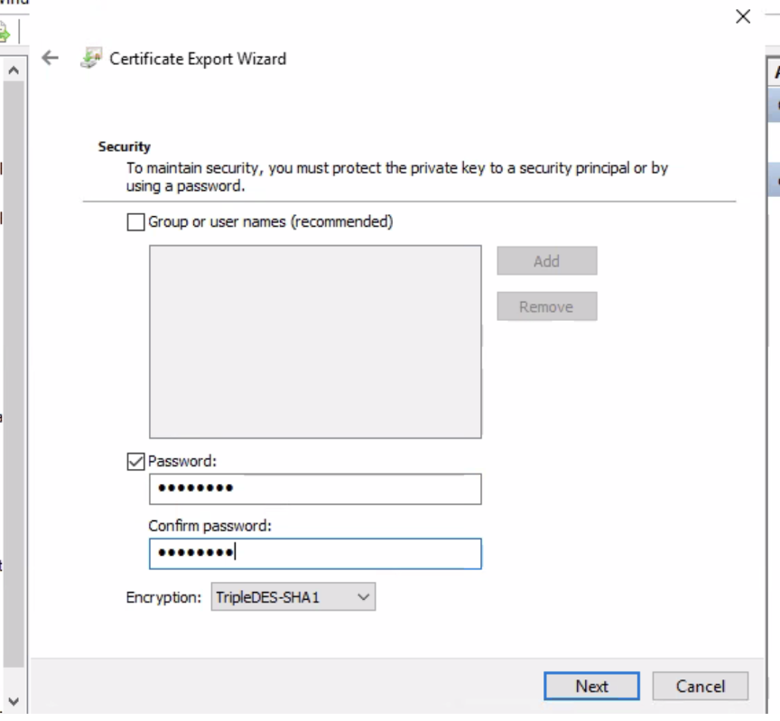 - Check the Password box and specify the password for the pfx exported. Then click Next