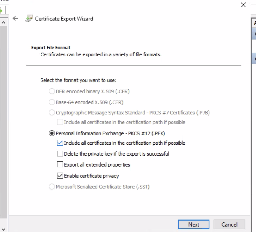 - Check the Password box and specify the password for the pfx exported. Then click Next